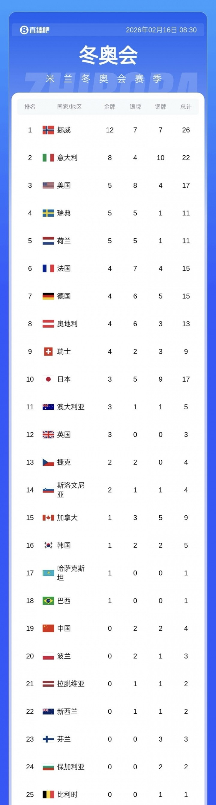 2026米兰冬奥会最新奖牌榜: