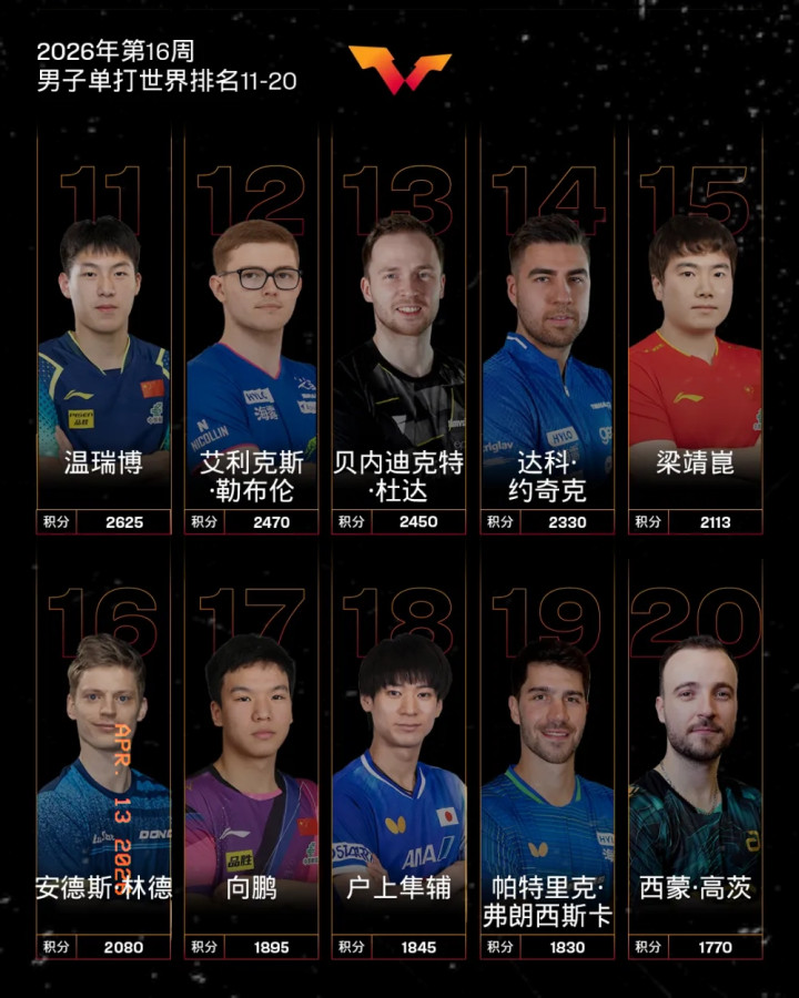 4月13日,国际乒联公布了2026年第16周的世界排名榜单。说真的,看完这份排名,我整个人都有点激动,尤其是男单这边,变化实在是太有戏剧性了。