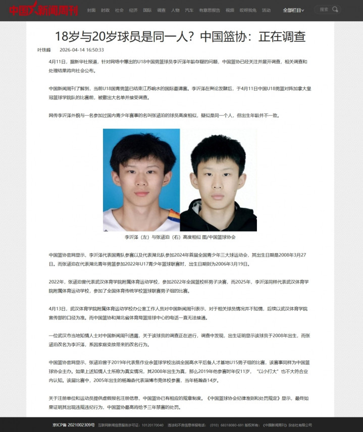 4月11日,据新华社报道,针对网络中爆出的U18中国男篮球员李沂泽年龄存疑的问题,中国篮协已经关注并展开调查,相关调查和处理结果将向社会公布。
