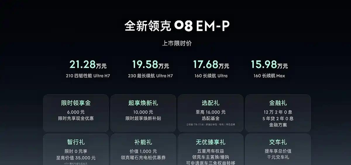 9月24日,新款领克08 EM-P正式上市了,新车共推出四款车型,售价区间为17.58-22.88万元,同时官方还给了限时价15.98-21.28万元。据悉,新车定位中型SUV,采用插混动力。另外,新车还标配了激光雷达达人配资,并且两个高配版还配了最新的索尔芯片。至于新车如何,我们接着看下去。